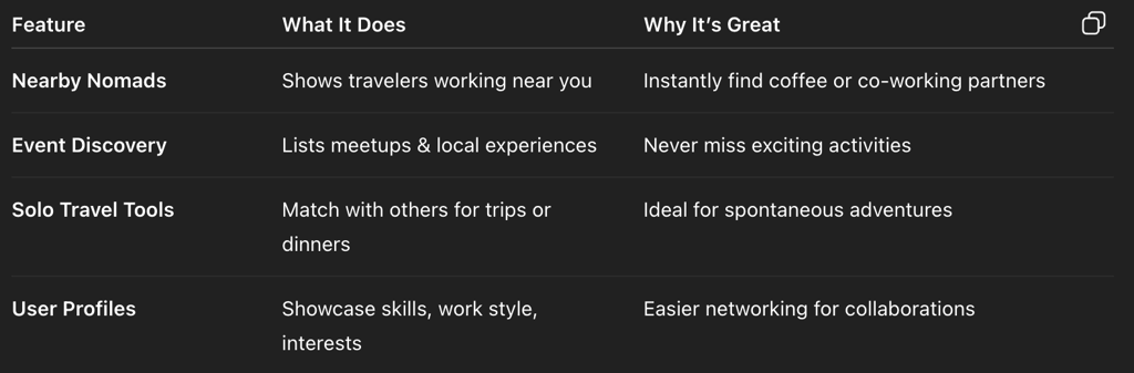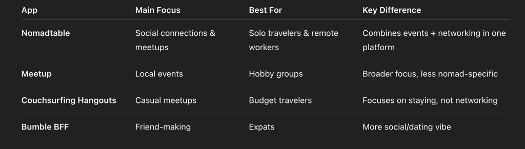 Nomadtable’s niche focus on digital nomads and solo travel sets it apart.